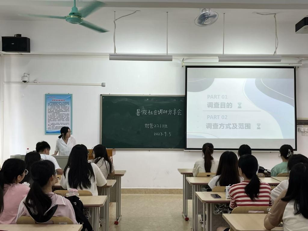 9月5日,财管221班于明德楼302教室开展暑假社会调研分享会,该班全体同学参与本次会议。会议由该班学习委员覃柄臻主持。