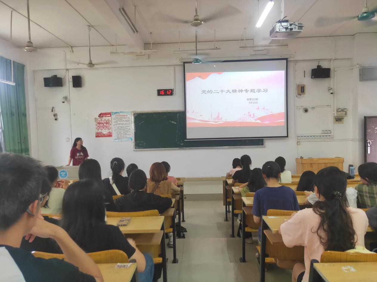为深入学习贯彻党的二十大精神,不断深化同学们的爱党情怀,财管222班于2023年9月15日在博学2101召开“党的二十大精神专题学习”主题团日活动,此次会议由团支书黄德辉同学主持,财管222班全体同学共同参与。