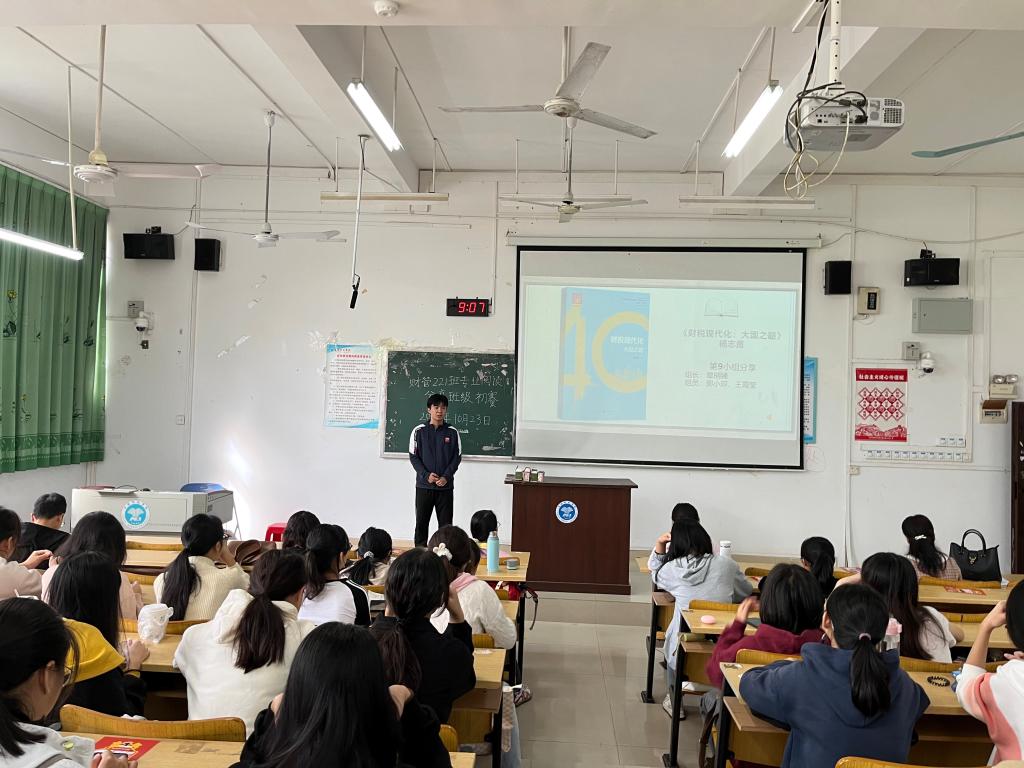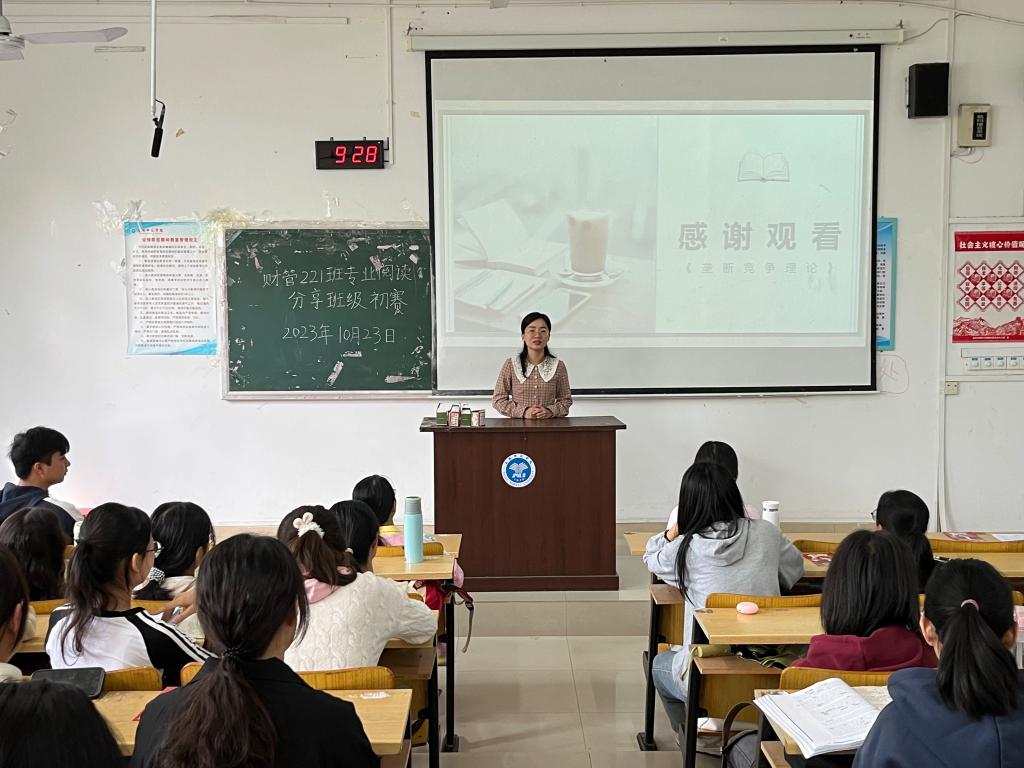 为引导和鼓励同学们博览群书、享受阅读,形成良好的阅读氛围和培养学习习惯,10月23日,财管221班于公司东校区博学楼1-102教室开展专业阅读分享会议。太阳成tyc33455ccwww团委书记、财管221班主任李晓丽,以及财管221班全体同学参与此次分享会。分享会由该班学习委员覃柄臻主持。