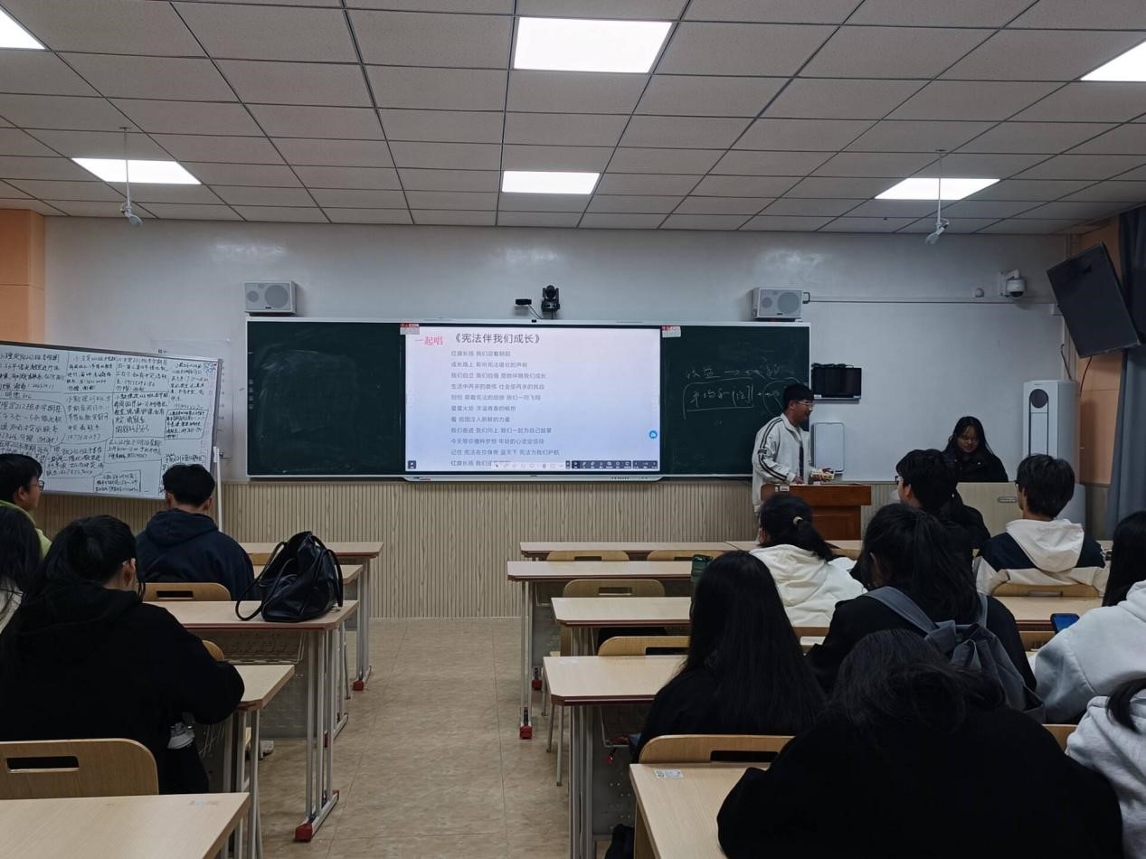 会议伊始,王勤书先引出了本次班会的主题,然后向同学们展示了《宪法伴我们成长》歌曲,并鼓励同学们一起歌唱,并向同学们发出倡议:从自己做起,从身边的小事做起,自觉做到学法、知法、守法、用法,做推广宪法,遵守宪法的小主人。