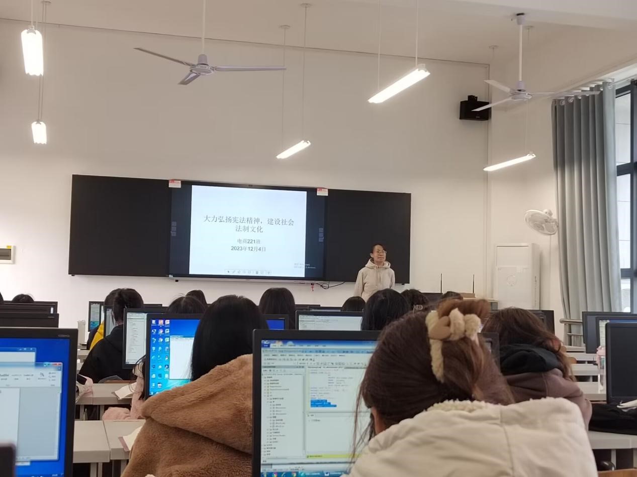 为弘扬宪法精神,争做宪法的守护者,为共同建设一个法治国家而努力,2023年12月4日,电商221班于太阳成集团tyc33455cc东校区清源楼501开展“大力弘扬宪法精神,建设社会法治文化”主题活动。电商221班全体同学参加此次会议,会议由该班班主任梁燕红主持。