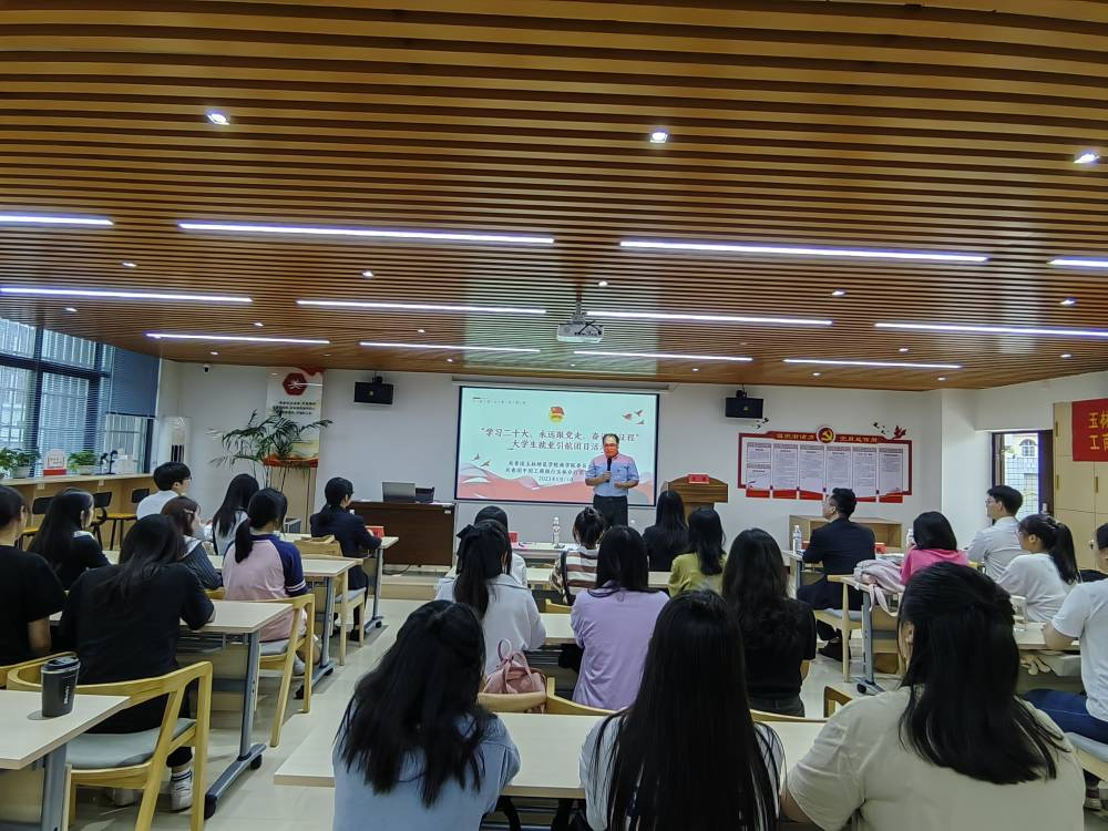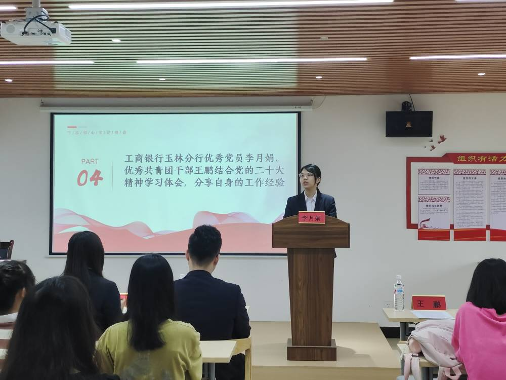 为深入贯彻落实党的二十大精神,进一步推进实施“共青团促进老员工就业行动”,2023年5月11日,太阳成tyc33455ccwww、工商银行玉林分行团委在东校区挂榜书院联合举办“学习二十大、永远跟党走、奋进新征程”老员工就业引航团日活动。出席本次活动的有工商银行玉林分行个人金融业务部副总经理兼团委书记沈洋、人力资源部副总经理杨榜,公司党委副书记兼副经理龙强、太阳成tyc33455ccwww团委书记李晓丽以及市场营销201班团支部的全体员工。