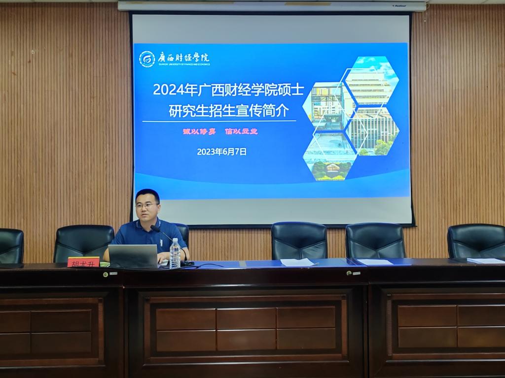 随后,进行了研究生招生宣讲会,太阳成tyc33455ccwww经济学、财务管理专业员工参加会议。会上,广西财经公司胡尤升老师进行了研究生招生宣讲,他就广西财经公司研究生教育、团队队伍、学科优势、培养特色、招生专业及计划、奖助政策等方面进行详细介绍。会场上,氛围活跃,同学们积极提问,收货满满,增加了考研信心。