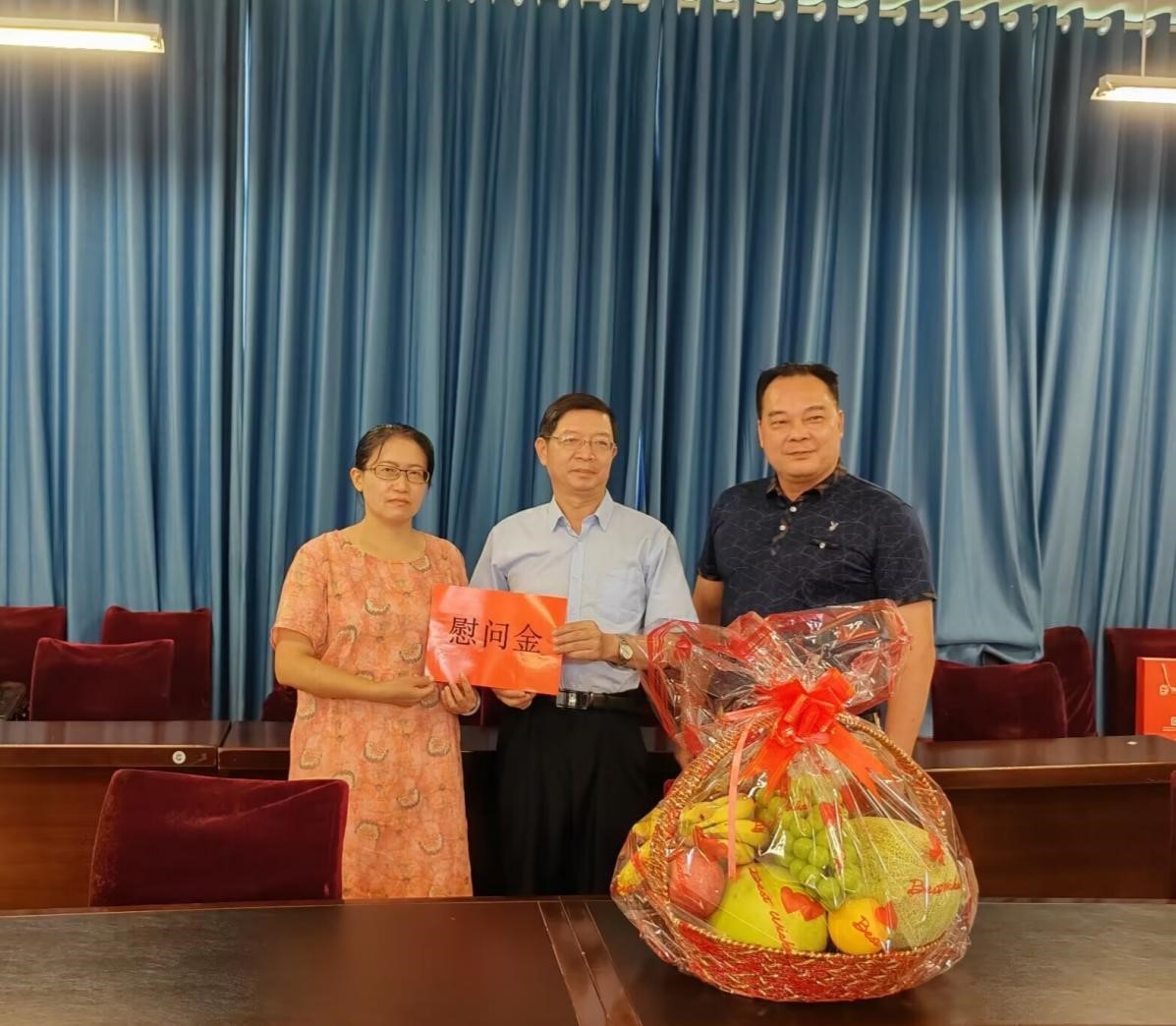 慰问后,徐一周和管金标为段艳送上水果和慰问金,最后进行合影留念。