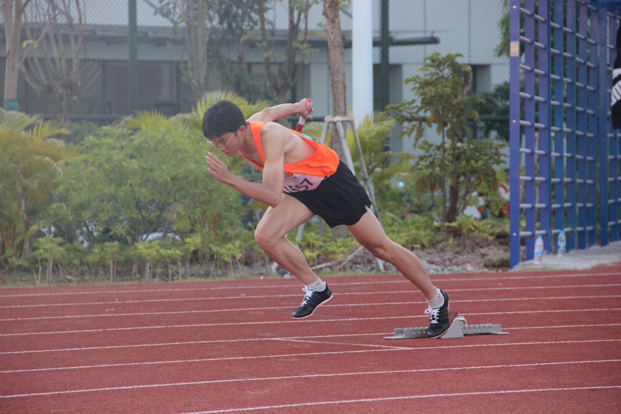 比赛前,运动员们都屏住呼吸,双手扶地,后退脚尖点地,前腿脚掌着地,聚精会神的盯着前方,只待听到枪声便像离弦的箭一般跑出去。一声枪响后比赛开始,运动员以迅雷不及掩耳之势冲向起跑线,展现了出色的爆发力和稳定的发挥力。整场比赛中,运动员们步伐矫健、团结一心、奋勇拼搏。赤色的跑道上他们奔跑的身影为此次运动会灌注了青春的朝气与活力。
