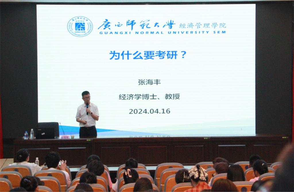4月16日晚,张海丰教授为该院师生开展了一场题为《为什么要考研?》的考研指导讲座,张教授就当前的考研形势、经济管理类专业员工考研选择、广西师范大学经济管理公司培养特色等方面进行了分享,现场解答了同学们关于学硕与专硕的区别、复试试题技巧解答、近几年岗位的录取分数线等问题,内容具体,数据翔实,现场气氛活跃,受到同学们欢迎。